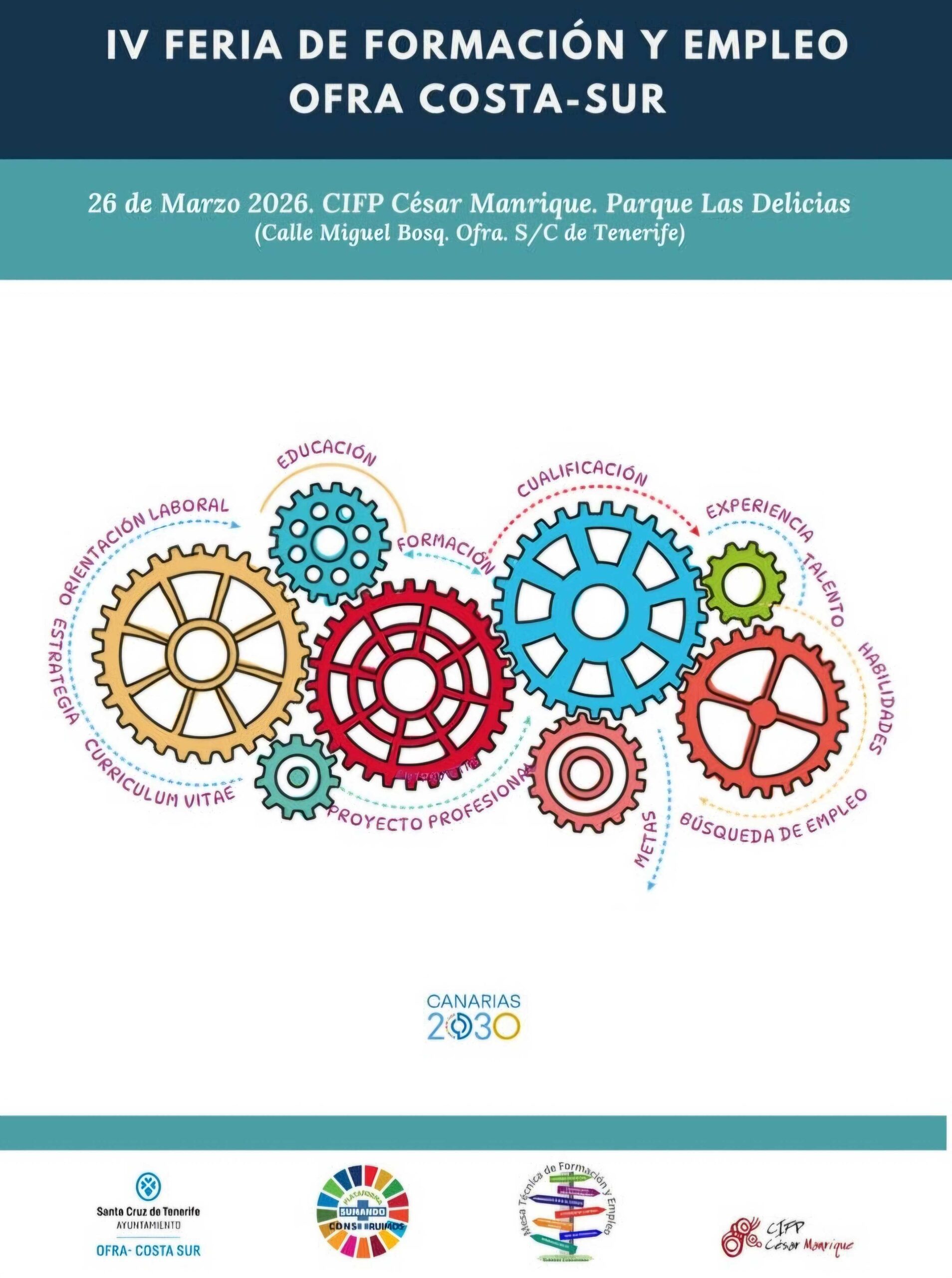 La IV Feria de Empleo Ofra Costa-Sur, tendrá lugar el próximo jueves 26 de marzo, en horario de 9:00 a 14:00, en el CIFP César Manrique y el Parque Las Delicias de Ofra, donde se realizarán talleres y charlas profesionales con empresariado, espacio informativo-orientativo a cargo de las entidades participantes.